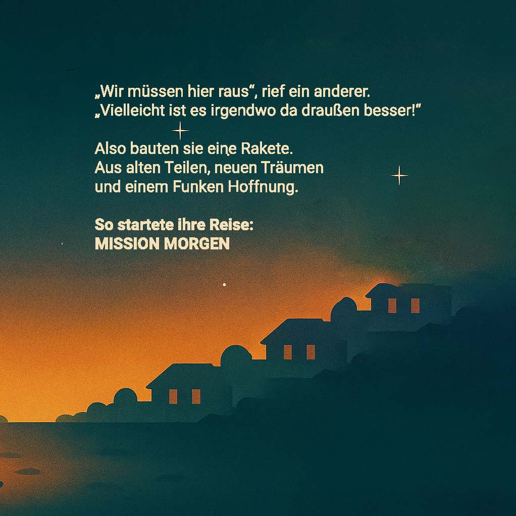 Mit unserem Büchlein laden wir Sie ein, diese Frage auf besondere Weise zu erkunden. Wir haben unsere eigene Geschichte geschrieben – MISSION MORGEN – ein kleines Buch über Aufbruch, Neugier und die Erkenntnis, dass das Wertvollste nicht fern von uns liegt. Denn unsere Welt bietet alles, was wir brauchen: Menschen, Ideen, Kreativität und das Wissen, gemeinsam Zukunft zu gestalten.