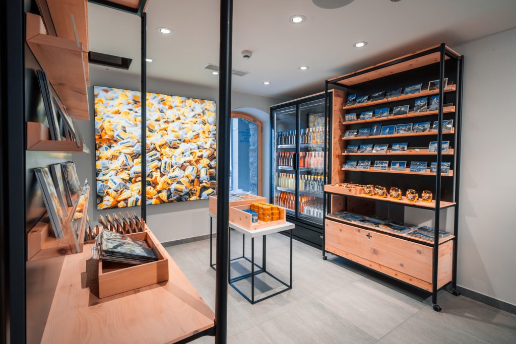 Eine besondere Rolle spielte für uns die Mitwirkung am Merchandising. Dass wir über den klassischen Ladenbau hinaus aktiv in die Auswahl und Konzeption des Sortiments eingebunden waren, ist alles andere als selbstverständlich – und macht dieses Projekt für uns besonders. Gemeinsam entstand ein stimmiges Gesamtbild aus Raum und Produkt. Regionale Hersteller, nachhaltige Artikel und bewusst ausgewählte Souvenirs wurden gezielt integriert. So trägt jedes Produkt die Handschrift des Ortes und fügt sich selbstverständlich in das architektonische Konzept ein.